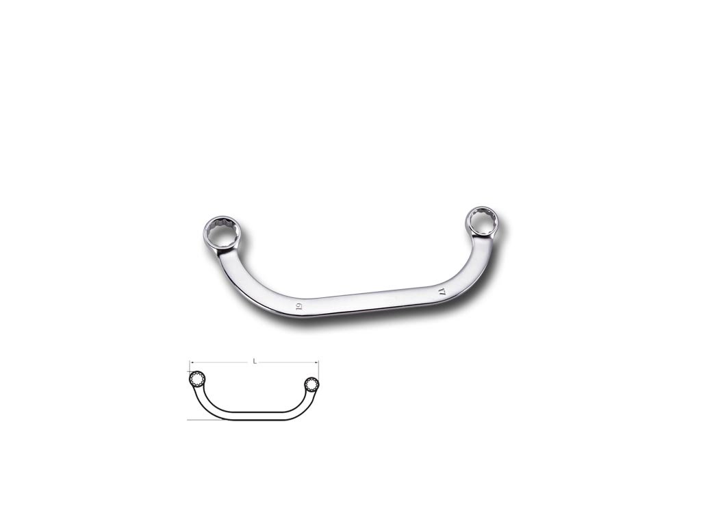 Očkový zahnutý klíč s rozměry 17 a 19 mm, určený pro práci v hůře dostupných prostorech.