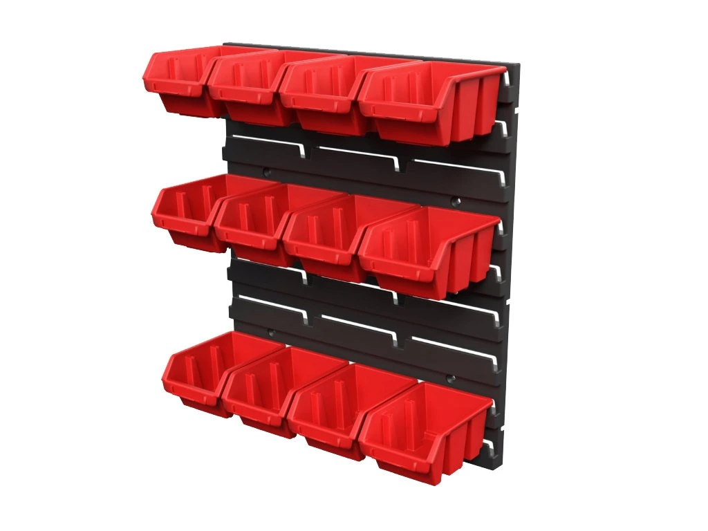 Nástěnný regál s boxy Regular Fixing Wall Set 1 je praktické řešení pro organizaci dílenského nářadí a drobných součástek. Skládá se z pevné plastové nástěnné desky, kterou snadno připevníte ke zdi, a 12 odnímatelných boxů Ergobox 0,5 l pro přehledné skladování drobností. Deska umožňuje rychlé zavěšení a výměnu boxů podle potřeby, což zvyšuje pořádek a efektivitu práce v dílně či garáži. Díky lehkým odnímatelným boxům máte nástroje stále po ruce a přehled o obsahu.