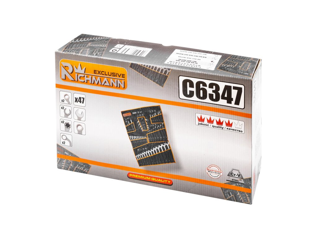 Sada 47 klíčů v 5 různých typech, chromovaných a uložených v plechové krabici. Sada obsahuje všechny nejdůležitější klíče používané v dílně: očkoploché, klíče na převlečené matice, zahnuté očkové, očkové a očkové vyhnuté. V sadě mají všechny klíče přiřazenou síťovanou kapsu.