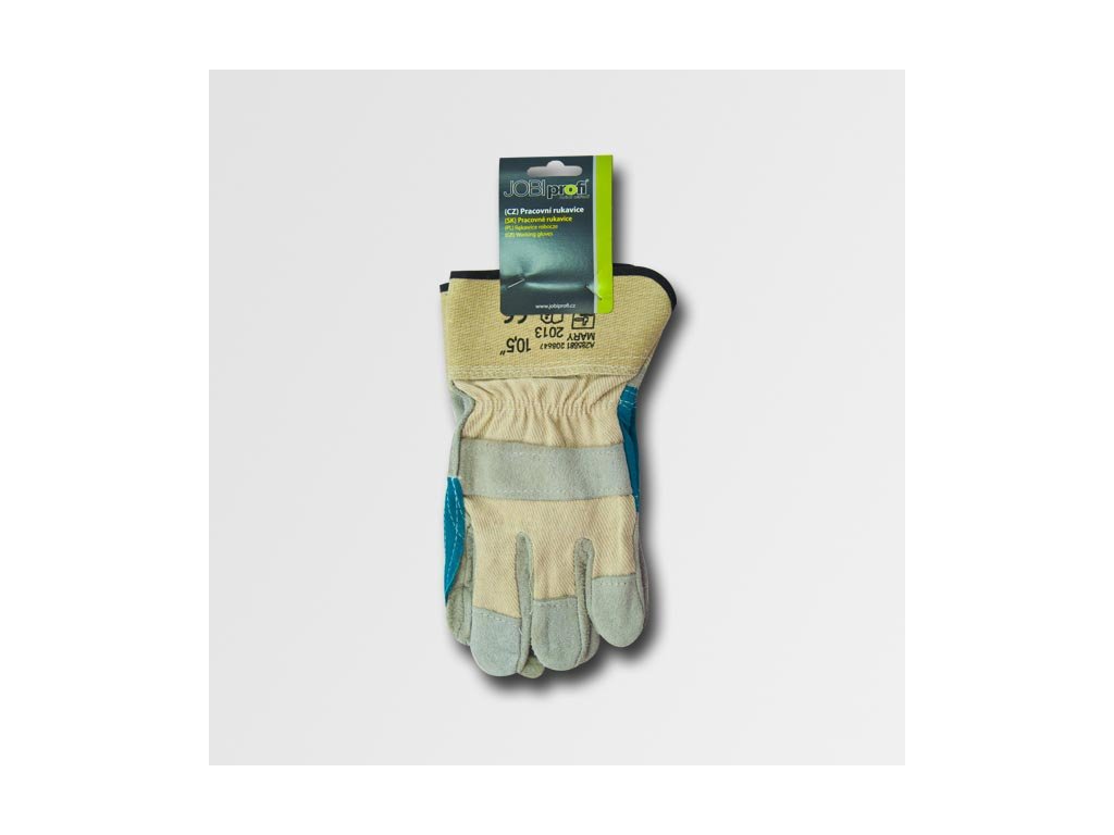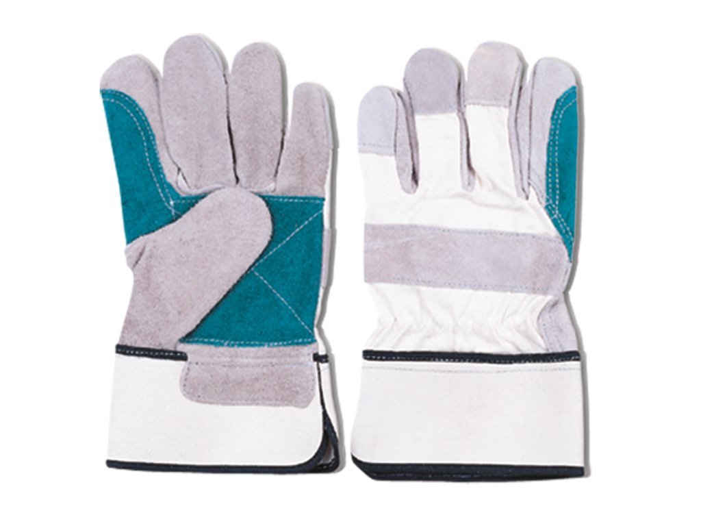 Zdvojená dlaň z šedé a zelené hovězí štípenky, hřbet a tuhá manžeta z bílé bavlněné tkaniny, podšívka ve dlani.