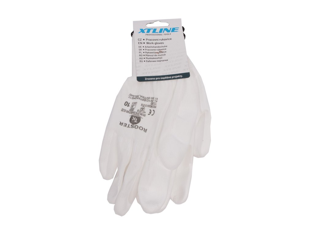 Bezešvé bílé rukavice z jemného nylonu, pružná manžeta, dlaň a prsty pokryté tenkou vrstvou polyuretanu.