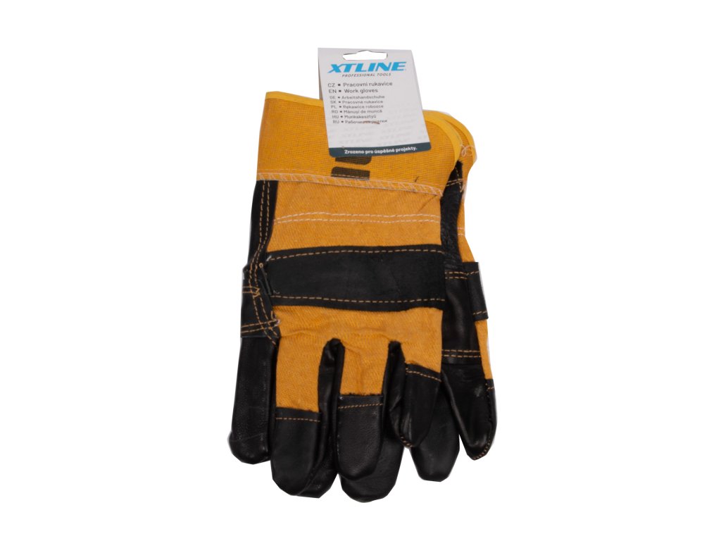 Dlaň z tmavé jednobarevné lícové nábytkové hověziny, hřbet a tuhá manžeta ze žluté bavlněné tkaniny