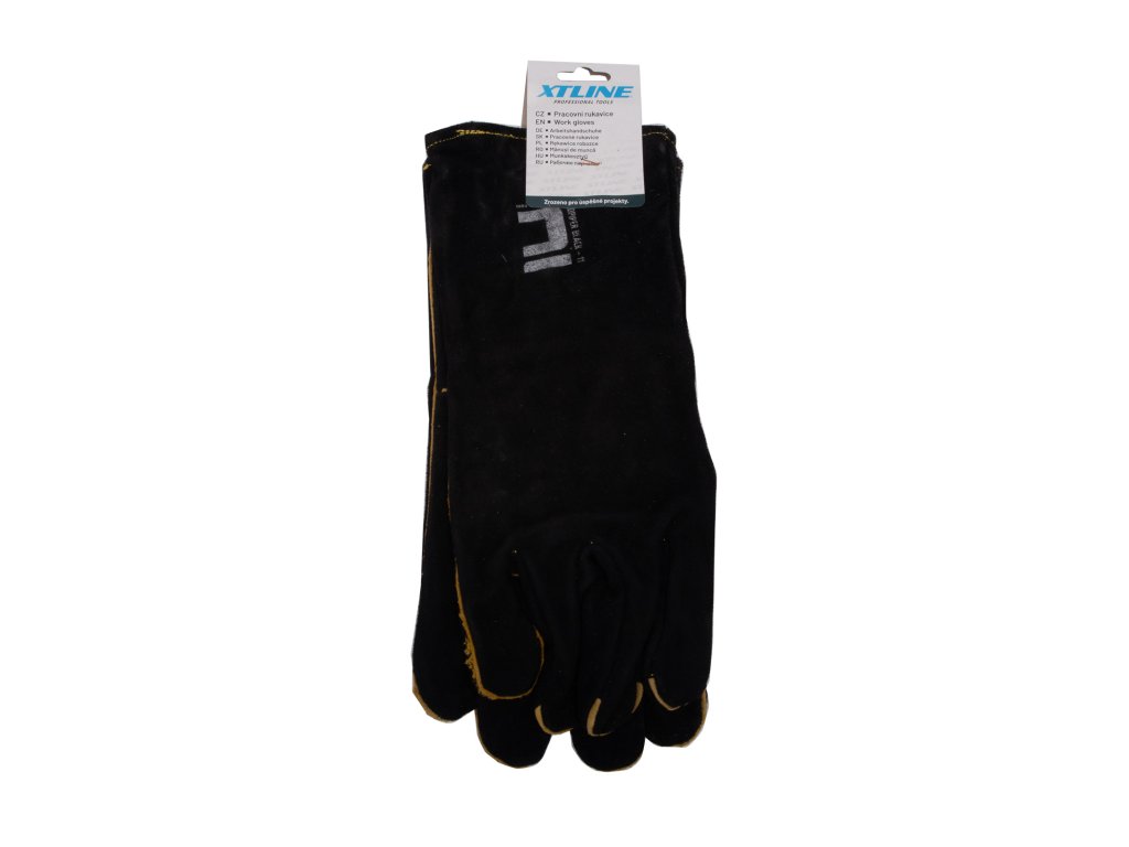 Celokožené rukavice z černé hovězí štípenky, délka 35 cm, kryté švy, kvalitní bavlněná podšívka, certifikát pro svářečské práce.