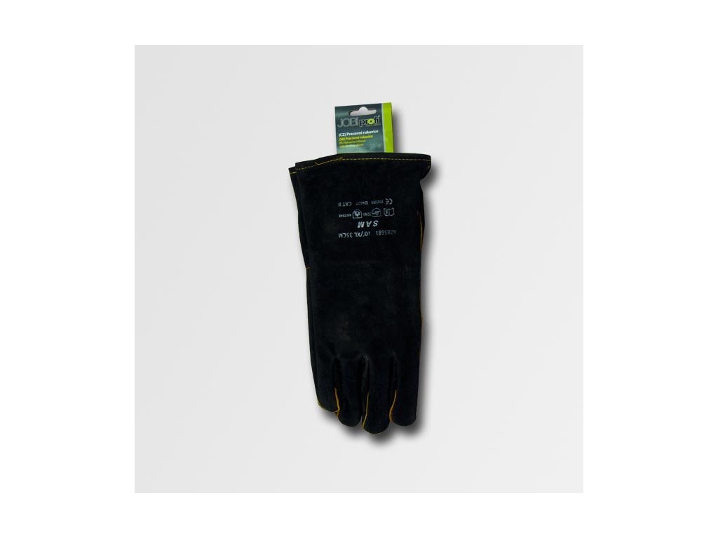 Celokožené rukavice z černé hovězí štípenky, délka 35 cm, kryté švy, kvalitní bavlněná podšívka, certifikát pro svářečské práce.
