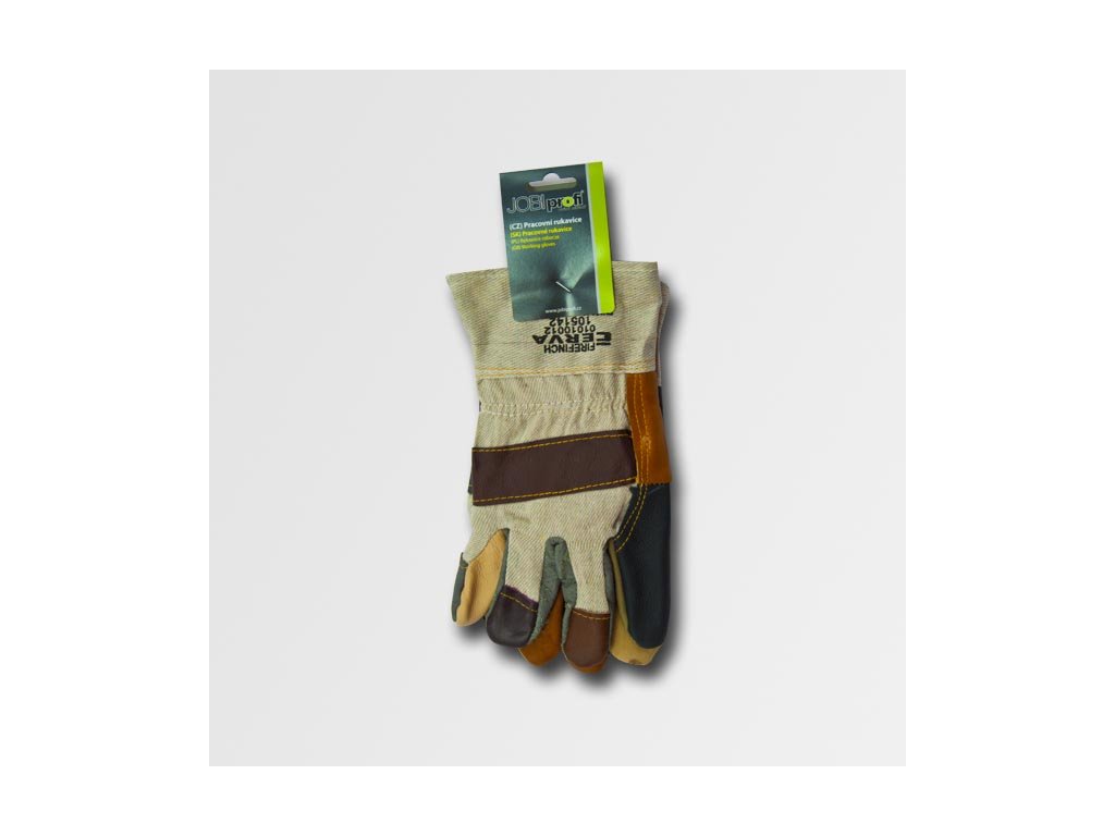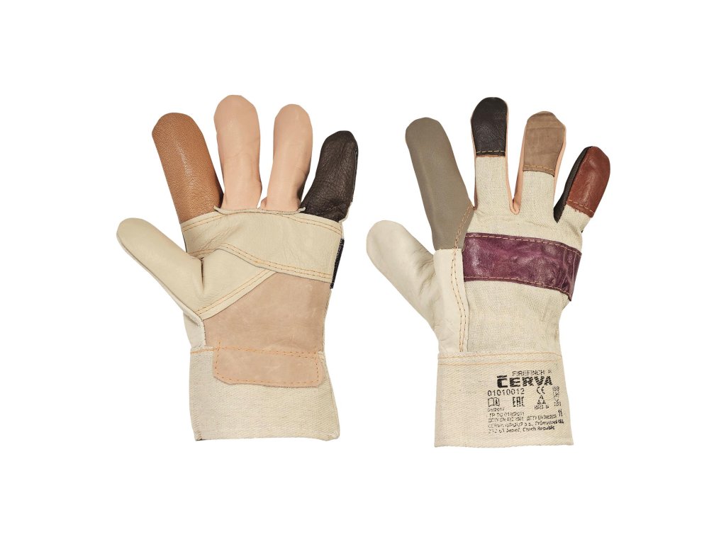 Zimní kombinované rukavice, dlaň z různobarevné lícové nábytkové hověziny, hřbet a manžeta z bílé bavlněné tkaniny, zateplená podšívka.