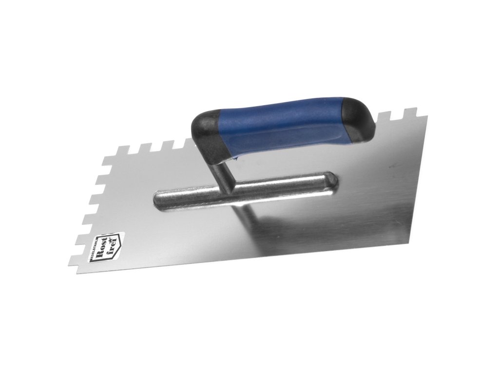 Nerezové hladítko, vhodné pro nanášení lepidel, malty atd. Dvousložková pogumovaná rukojeť.