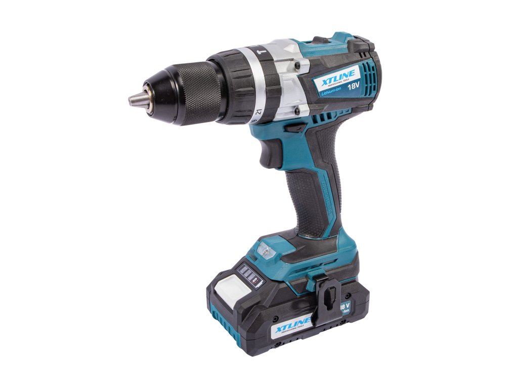 XTLINE Aku vrtačka s příklepem bezuhlíková 18 V, 65 Nm + 2 baterie 2.0 Ah + nabíječka 2.4 A