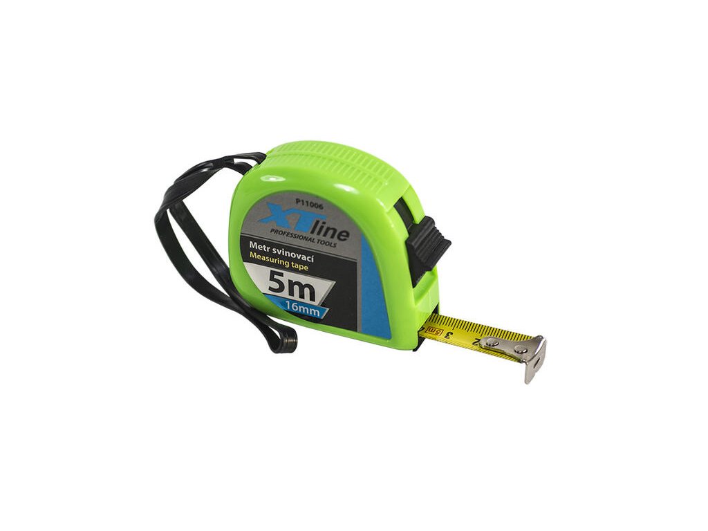 Plastový metr s tenkou ocelovou měřící páskou.