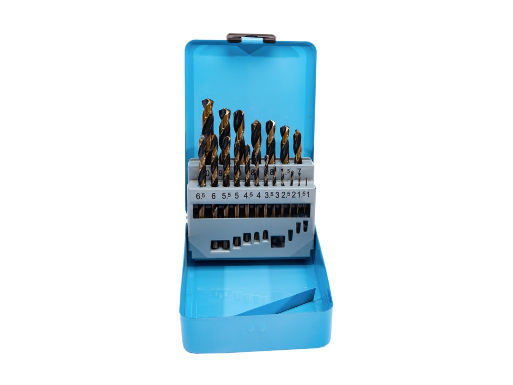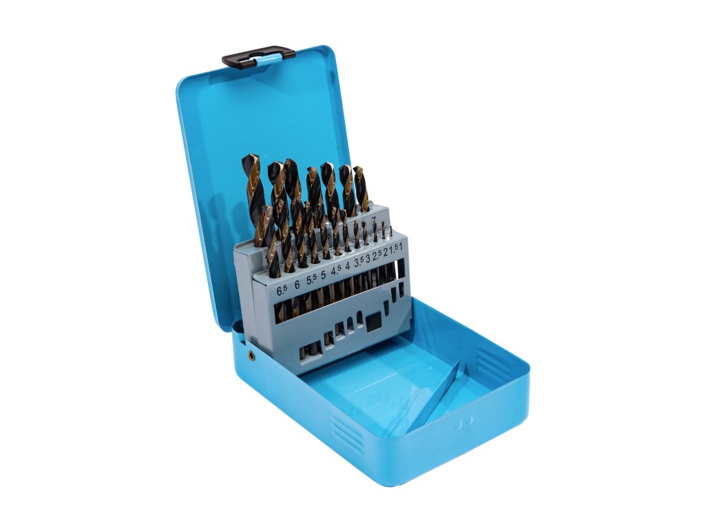 Sada vrtáků do kovu vyrobených z HSS oceli. Vrtáky jsou uloženy v kovovém boxu. Lze opětovně brousit.