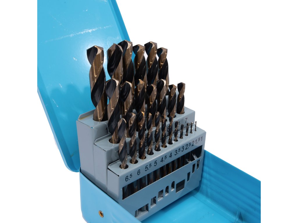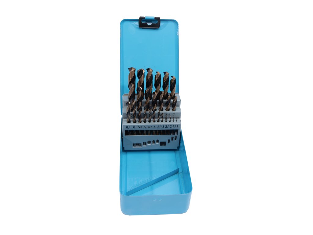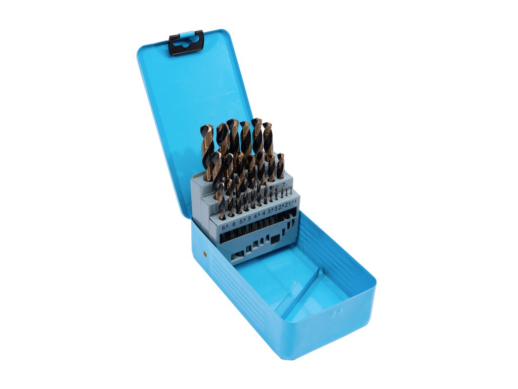 Sada vrtáků do kovu vyrobených z HSS oceli. Vrtáky jsou uloženy v kovovém boxu. Lze opětovně brousit.