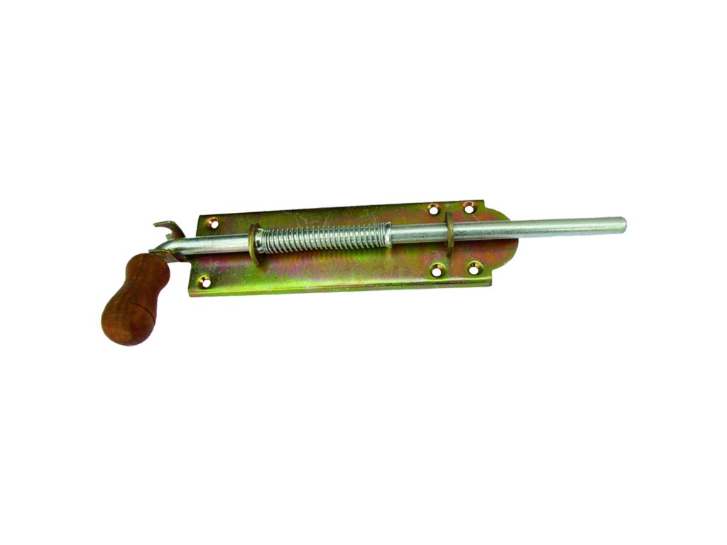 Zástrč pružinová s dřevěnou koncovkou. Různé délky. Uzamykací jezdec z kulatiny je osazen pružinou, která Vám usnadní zamykání. Různé rozměrové varianty zástrče pro různé velikosti branek, vrat apod.